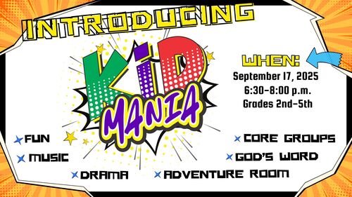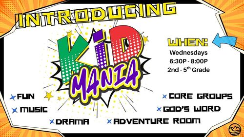 Our Wednesday night programs will resume on September with Kid Mania (2nd - 5th grade) and Wednesday night childcare (3 years - 1st grade) for parents participating in Wednesday night LIFE groups.